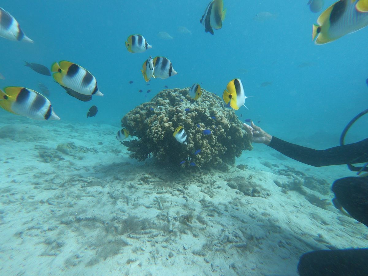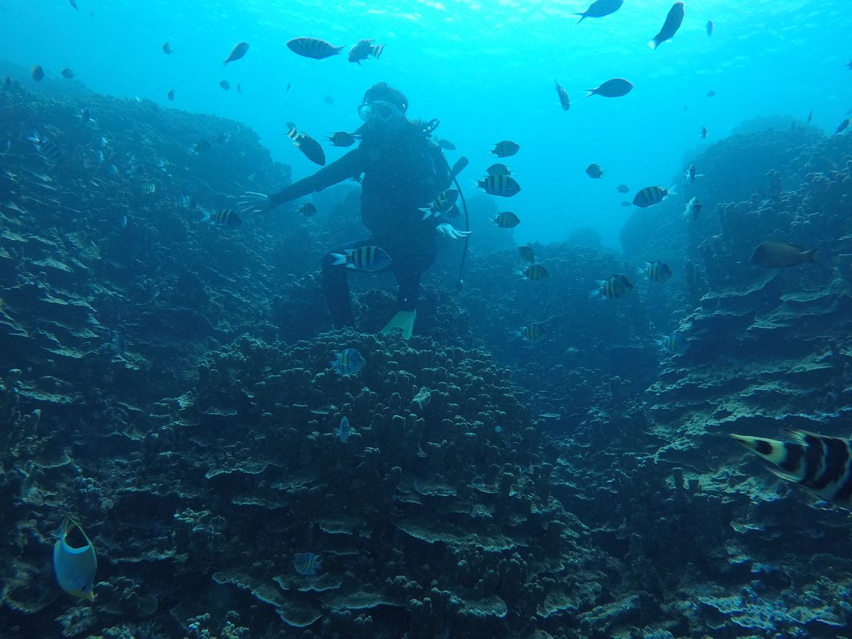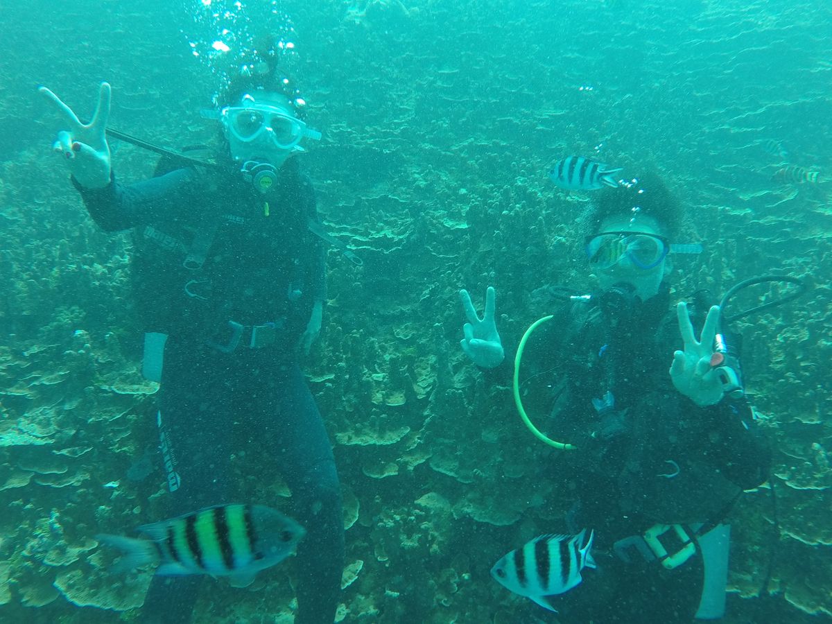 1本目のビーチエントリーでは日本人スタッフの方が分かりやすく呼吸のコツや水中でのサインなどを教えていただきました。2人とも緊張していましたが分かりやすい説明で楽しく潜ることが出来ました。途中耳抜きがうまく出来なくて焦りましたが、優しく教えていただいたおかげで無事に6mくらいの深さまで泳ぐことが出来ました。魚に餌をやっている様子をインストラクターの方が借りたGoProカメラで撮影もしてくださり、とてもいい写真ばかりでした!