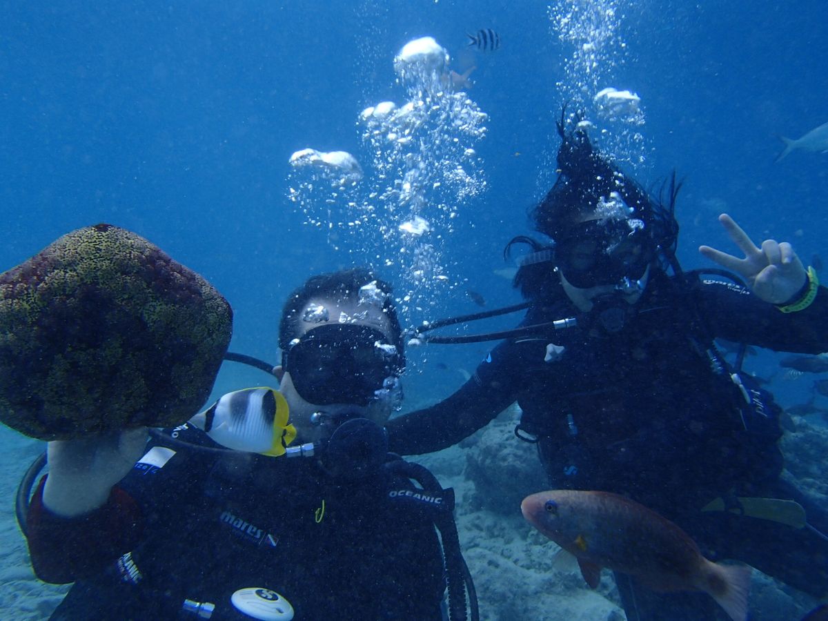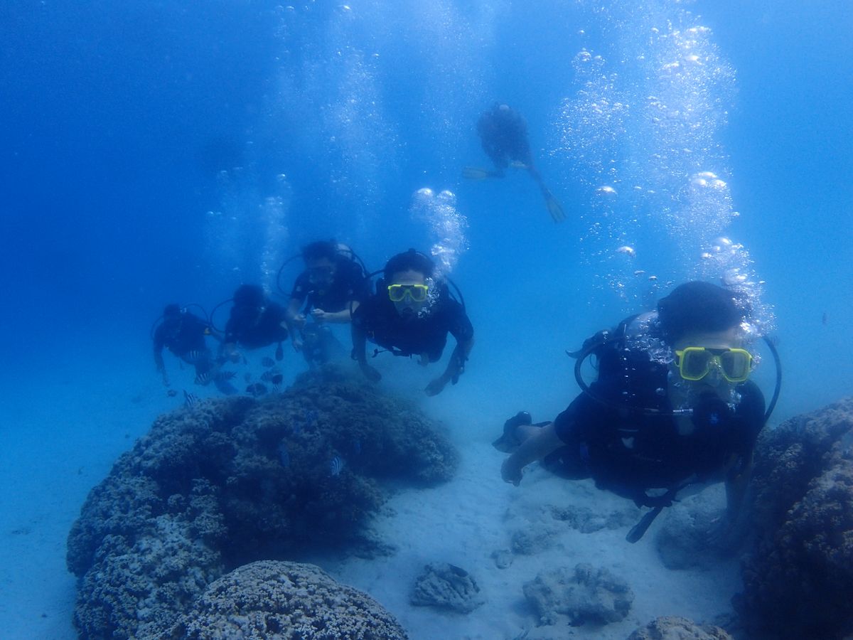 先週25歳の娘と2人で参加させて頂きました!ご一緒に参加されていらしたのは元気で明るくて感じの良い6人の大学生の皆さんでした。参加者8人中私だけ50代後半だったので、皆さんの足をひっぱったらと最初はとても不安でいっぱいでした。最初は慣れてついていくのに必死でしたが、最初にしっかりご説明があり、海中でも全く初めての私でもよくわかるように、厳しくかつ的確で丁寧なご指導を初期段階から頂いて練習しているうちに、途中からいつの間にか肩の力が抜け始め、心から初ダイビングを楽しんでいる事に驚きました!初めてで不安いっぱいだった私が7メートルも潜ってたくさんの綺麗な魚に囲まれて娘と一緒にこんなに楽しめる事が出来るなんて最初は思っていませんでした。本当に幸せな体験でした!初めての同年代のダイビングを不安だけどやってみたい皆さんにお勧めです!しっかり後ろについて頂いて良くみて下さったので安心感がありました。撮って頂いた写真やビデオもすごく綺麗で良い記念になりました!本当に楽しい初ダイビング体験をさせて頂き、ありがとうございました!!