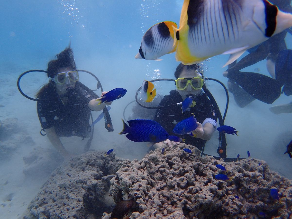 水中で魚たちを見る方法は色々とありますが、せっかくマスクを付けることで鼻呼吸が制限され、タンクを背負って歩いて海に入るわけですので、ダイビングの魅力を存分に味わっていただきたいというのが自分の思いですので浮遊感を味わえる本当のダイビングを体験していただいています。