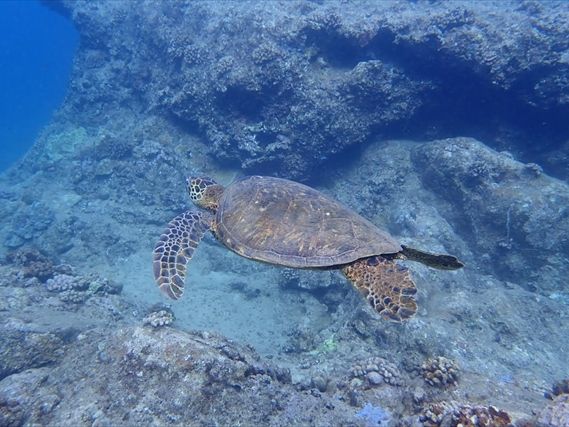 海中で魚たちを間近で見ることでも感動的だったのにウミガメにも3回出会うことができました。
