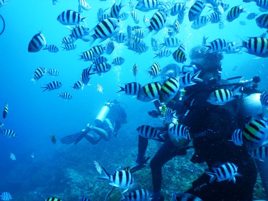 ライセンスを持っていなくて、ツーダイブしたのですが、1回目では初心者の人でも安心なように浅いところでなんども練習させてもらいました。2回目のダイブでは船で沖に出て、本格的に潜りました。お魚のエサを購入して、あげました。