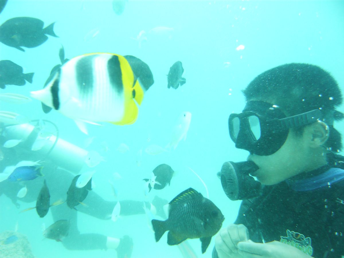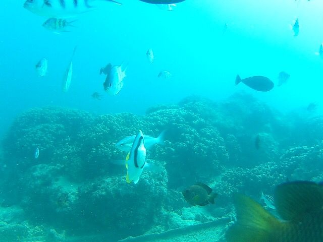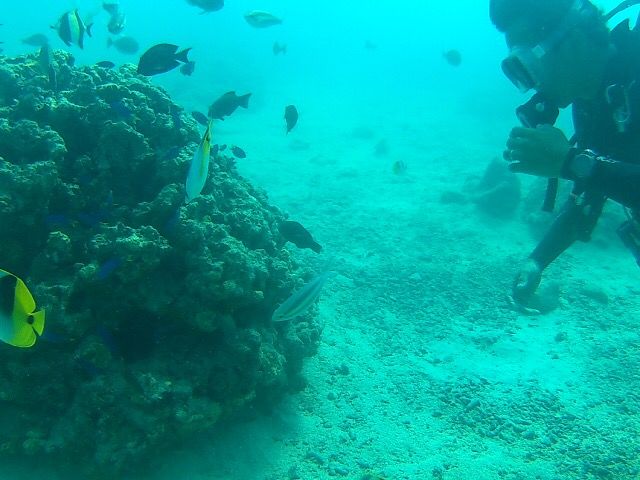 主人は、なかなか耳抜きか出来なく、うえのほうを泳いでいましたが、潜水時間が長いツアーなので、何度か耳抜きして、最終的には、3人で、水深12メートル位まで行き、たくさんの魚や、サンゴ、魚の群れを見れました。