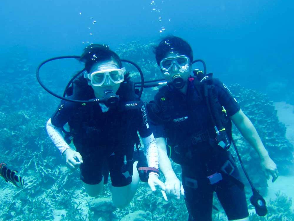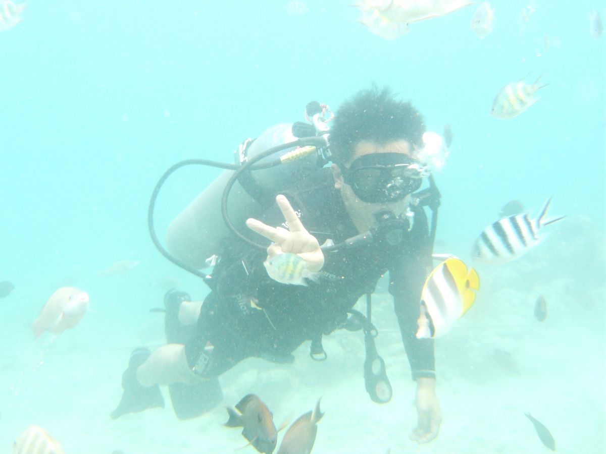 ダイビングは初体験でしたが、十分に楽しむことができました。ビーチ&ボートダイブを一回ずつでしたが、初心者にはこれが正解でした。ビーチでは足のつく深さで練習してから徐々に深くしていけたので、ステップを踏んで慣れることができました。その甲斐あって、ボートダイブは飛び込んだ瞬間から、問題なく時間いっぱいダイビングを楽しむことができました。初心者ながら、カメラをハウジングして水中写真に