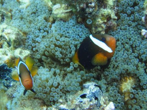 クマノミの城だ。クマノミの城には親も居れば子供もたくさん居ました。インストラクターのダグさんからソーセージを頂き餌付けも楽しめました。
