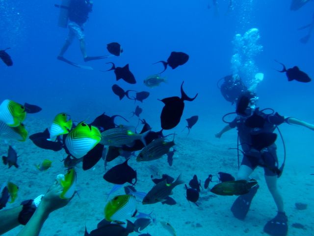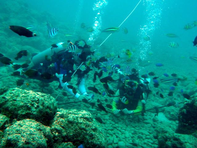 次に浅い海中のサンゴ礁に張ったロープまで進み、群がる熱帯魚に餌をやりながらの耳抜きの実習でした。