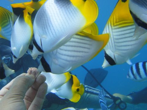 特にえさやりは、小さな魚やきれいな魚に指を突かれて