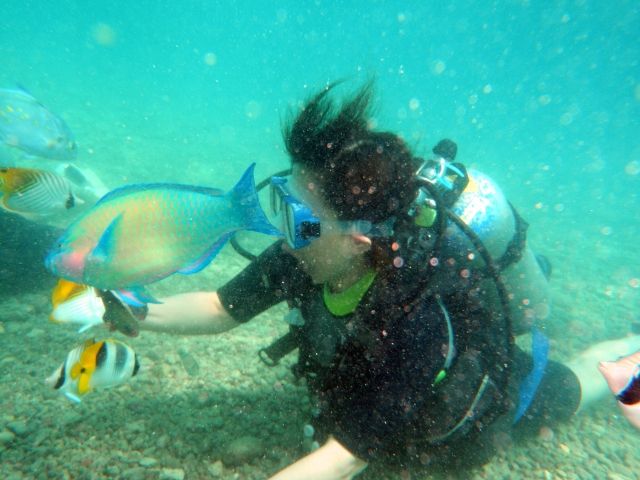 私たちは初めてのダイビングでした、連れはいとも簡単に潜る事が出来たのですが、私は耳抜きがなかなかうまく出来ず、うまく潜ることが出来なかったのですが、YUKIKOさんは手を握ってくれたり、常に気遣ってくれて、最後のほうでは、なんとか潜る事が出来、お魚にもエサをあげる事が出来ました!
