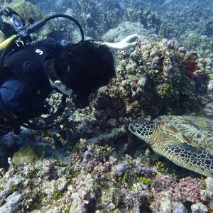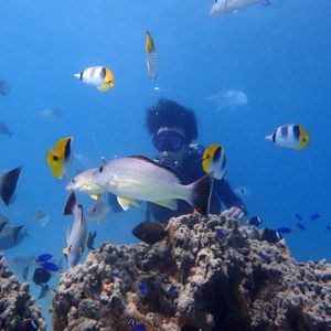 海水に慣れながら身近に綺麗な魚たちを観ることが出来ました☆暫く楽しんだ後日本人インストラクターに代わり、カヤックで少し沖に行き、酸素ボンベを装着して海中へ。丁寧に優しく引率してくれたので安心して潜ることができました!初心者で中々思い通りにならない時も軌道修正してくれたり合図を送ってくれるなど、見どころへ誘導され活き活きとしたサンゴの絨毯を見ながら進み、珍しい魚たちと戯れることが出来ました(^^)