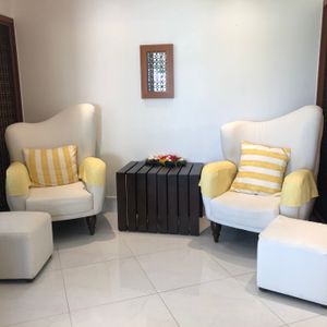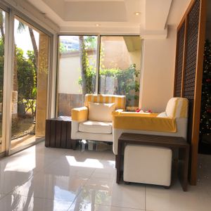 私どものスパはグアムらしい陽の光が差し込むスパとでしてデザインされておりますため、白と黄色を基調にしており、ラウンジからはタモン湾を一望いただけます。