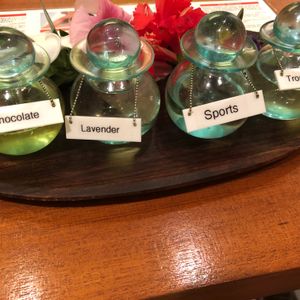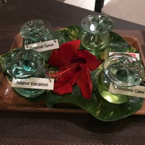 まず受付で、日本人の方(私が訪問した際には2名いらっしゃいました)とお話しながら、体の状態についてのアンケートを記入したのち、オイルの香りを選びます。オイルは、チョコレートケーキ、トロピカルスパイス、スポーツ、ラベンダーから選べました。私はいつもであれば自然な香りを選びがちなのでトロピカルスパイスに惹かれましたが、折角のリゾート・想い出になるかなぁ~と、なかなか見ない珍しい、スイートな香りのチョコレートケーキを選択しました。(ちなみに、原価は一番高いそうです笑)