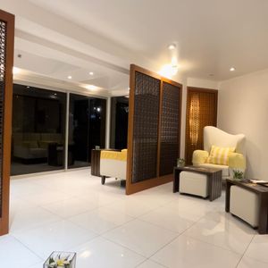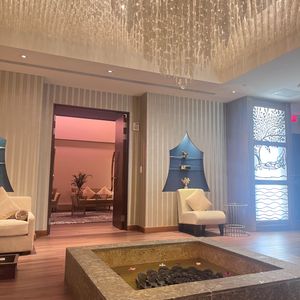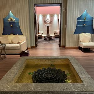 スパの入っているデュシタニホテルは初めて訪れましたがホテルのいたるところが素敵な上、スパの入ったところから豪華なシャンデリア、その後案内されるリラクゼーションルームも優雅でかなりテンションが上がりました!そちらでお茶をいただき、その後施術のお部屋のシャワーを浴びる流れでした。私達の予約したコース(Inspired Massage 90分)は更衣室やお風呂(広くてあったまれると口コミにあったので利用してみたかったのですが^^;)は使えずその点は残念でしたが、ちゃんと2人一緒に施術してもらえるお部屋で綺麗で癒されました。
