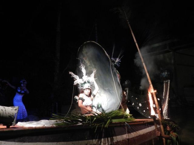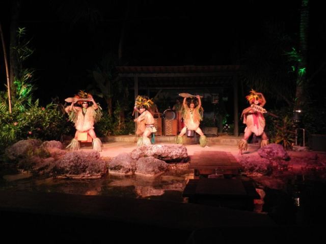 もうお腹いっぱいってところで会場が暗くなりショーがスタート。南国美人が舟に乗って舞台に登場。鳴り響く太鼓のリズムと激しい南国の踊りと甘よかなボーカルのおじさんの歌声。やっぱ南の島に着たんだな~って改めて実感。