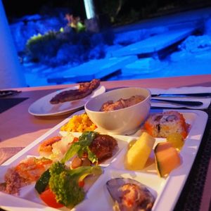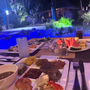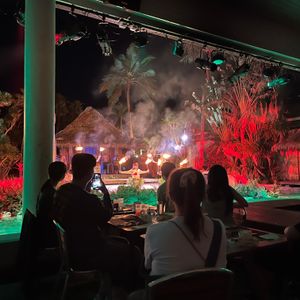 別のホテルに泊まっていたのですが、当日ホテルまで迎えがあり、夕日が沈む前に到着して海を眺めながら食事を始めることができました。店員さんの気遣いが良く、いろいろと気にかけてくださり助かりました。ご飯の途中でファイヤーダンスショーが始まり、とてもかっこよく圧巻で食べることを忘れたほどでした!ショーの後もパフォーマーの方と一緒に踊る機会があったり、写真撮影ができたりと距離が近くとても楽しい時間を過ごすことができました。ご飯はボリューミーでお腹いっぱいに食べることができ幸せでした。素敵な時間になりした。また行きたいです。