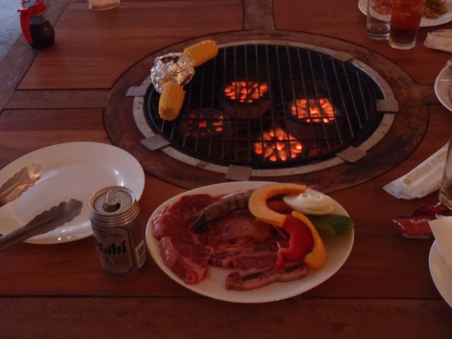 すでにBBQの火は入っており、焼き食材とビールもテーブルにセットしてありました。パラダイスメニュー選択でこのコースではお肉が食べ放題ですが、最初にあるだけでかなりのボリュームがあります。私たちは全部食べきれませんでした。(もっとも、おかわりの方法が分からなかったので結果オーライですが)肉も野菜も豪快な切り方で出てくるので、がぶりと頬張ると楽しいよ~ ちなみにご飯やサラダ、ソフトドリンク、ビールの追加などはバイキング方式です。始まって30分ぐらいは長蛇の列でした。
