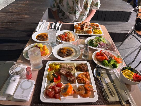 料理はバイキング形式でしたがバラエティに富んだメニューで美味しく食べることができました。会場が外のステージと繋がっているため気温が高くけっこう暑いのが大変なところです。