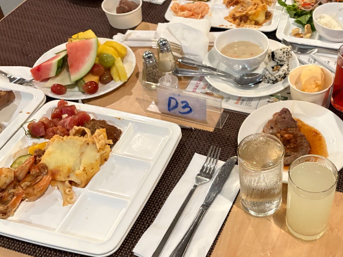 食事はビュッフェスタイルで、ステーキと海老はチケット交換性でした。トイレも綺麗でした。