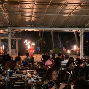 参加した日はあいにく曇りがちで、サンセットを楽しむことは出来ませんでしたが、私たちに関しては、集合時間の遅延も無く、大変スムーズなものでした。日航ホテル到着後は、あらかじめ決められていた席に「ノリノリ」のスタッフによって案内され、19:30のショー開演まで、食事を楽しむという流れですが、炭や食材の追加には直ぐに対応してくれました。砂浜のステージを囲むように設けられた客席から見る、激しいファイアーダンスは迫力満点、終了後の写真タイムは、皆さんフレンドリーで気さくに応じていただき、楽しめました。BBQは、「タレ」に工夫かあれば満喫出来たかなと思いますが、食材はとても良かったです。