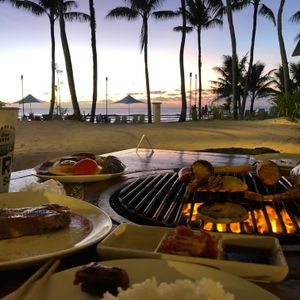 ニッコーに宿泊していたので、受付開始の6時15分に会場に到着。すでに数名の方が並ばれていましたが、すぐに席に案内してくれました。席につくとスタッフの方が「始めてね」みたいなことを言ったので、BBQ スタート。食べるのが遅いので、サンセット見たり、写真撮ったりしてたら1時間じゃあ短いかなぁと思っていたので、少し早くスタートできたのは、うれしい誤算でした。パラダイスコースにしたので、骨付きカルビとチキンは食べ放題ですが、最初のセットだけでも、結構ボリュームがありました。後半、火が弱くなり、全然焼けなくなってきたら、スタッフの方が炭を補充してくれました。他の方の体験談を拝見すると、声を掛けて炭を補充してもらっていたようなので、火が弱くなってきたら、早めに御自身で声掛けすることをおすすめします。初めてサンセットBBQディナーショーに参加しましたが、とても良かったです。忘れられない思い出になりました。