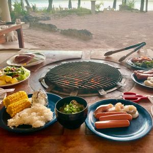 バーベキューは肉と魚介類と野菜の盛り合わせで、一人前のボリュームが