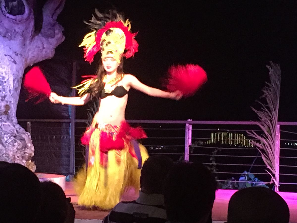 サンセットを眺めつつバスに戻ると、道路を挟んで向かい側の施設入り口に横付けされ、入って行きます。入り口でダンサーの方との写真がありますが、私たちはスルーして、受付に。席に案内されます。かなりの人で、韓国の人もそこそこいた感じ。施設は、野外のステージと屋根の下のテーブル席で構成され、エアコンはありません。我慢できないほどではありませんが、服の下に汗をかくくらいには蒸し暑いです。天井から扇風機がぶら下がって回っていますが、真下にいないからか、風は感じませんでした。
