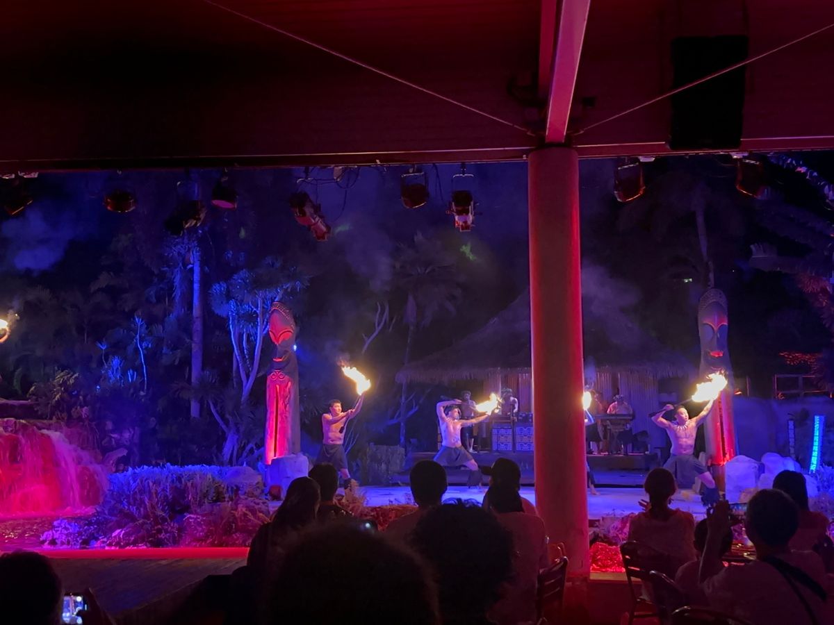 開催2日前で予約は取れましたが、当日は満席でした。レビューで色々書かれていたホテルへのお迎えは特に問題無く、むしろ早めに着いたので、子供は隣接のビーチで走り回ってました。私の記憶だとショースペース付近の席を確約する少し高いプランがあったような気がしましたが、ショーが始まればみんな食事を終わりにして席から離れて前の方に一斉に動き出すので、あまり細かいことは気にしなくて大丈夫です。ただしトイレは会場内にはなく隣接のビーチ用の砂だらけのトイレといった感じで、会場から一番近いところでも階段の上り下りがあるので、シニア世代や小さいお子様連れの場合は、タイミングに気をつけたほうが良いでしょう。
