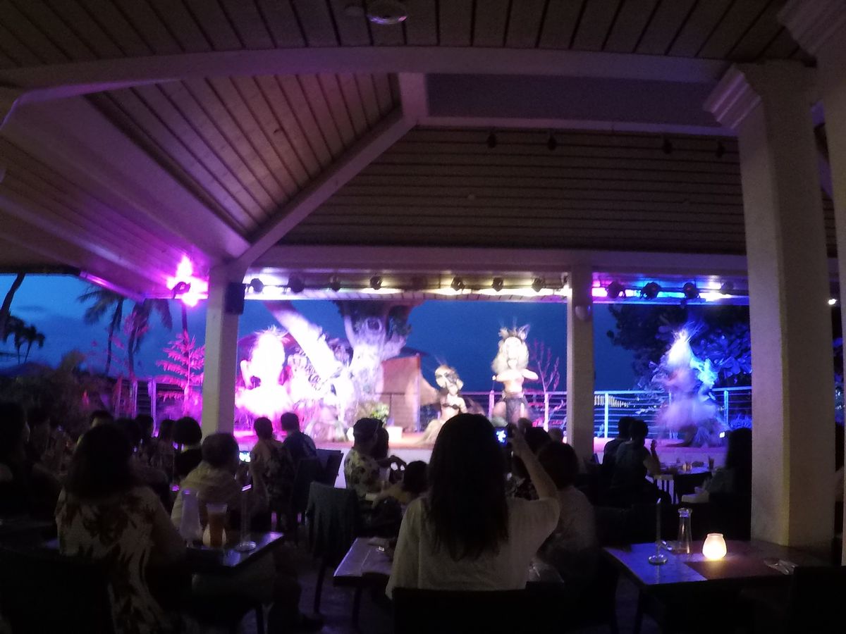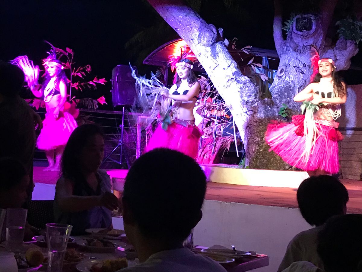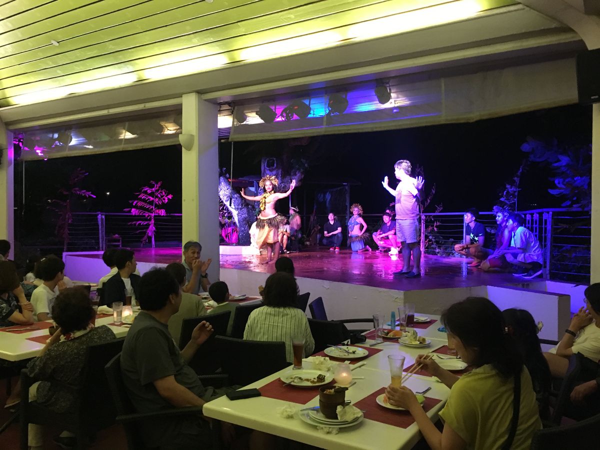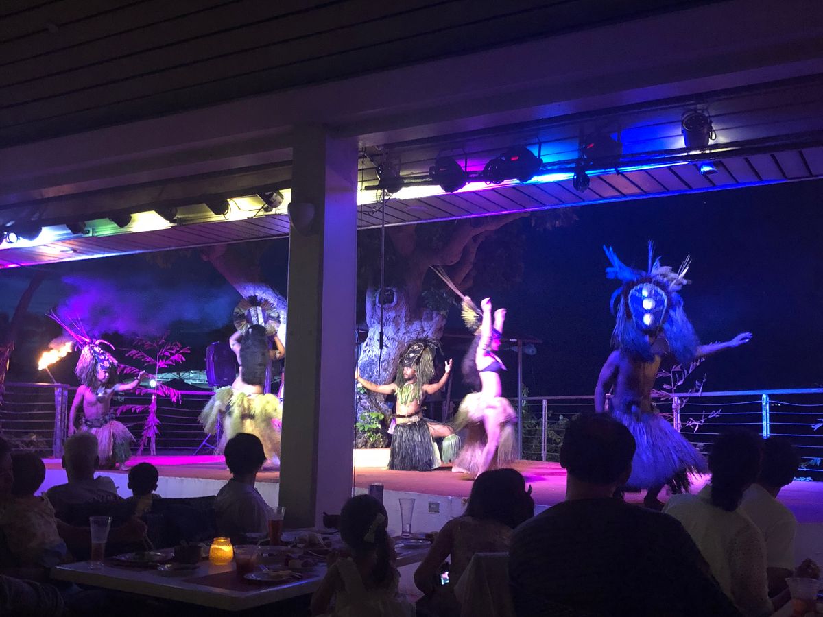 曇っていてサンセットが見られなかったのは残念でしたが、ステージに近い席だったのもあり音楽とダンサーの足音や鳴り物のリズムの迫力はすごかったです。食事の時間も十分にとられていて、(バイキング形式でデザートやフルーツは後から出されていたので、ゆっくり食事をしてからデザートを取りに行くとあまり残っていないかもしれません。)チャモロ料理の内容も肉類が中心でしたが味は日本人でも好む味付けで子供たちも大満足でした。
