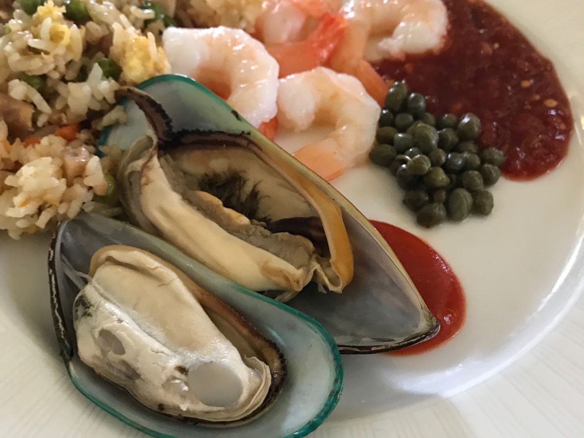 食事はビーフステーキとムール貝とスペアリブが美味しかった。デザートにフレッシュフルーツが出たので嬉しかった。ドリンクはお酒飲まない人はフリーにしなくていいと思います。