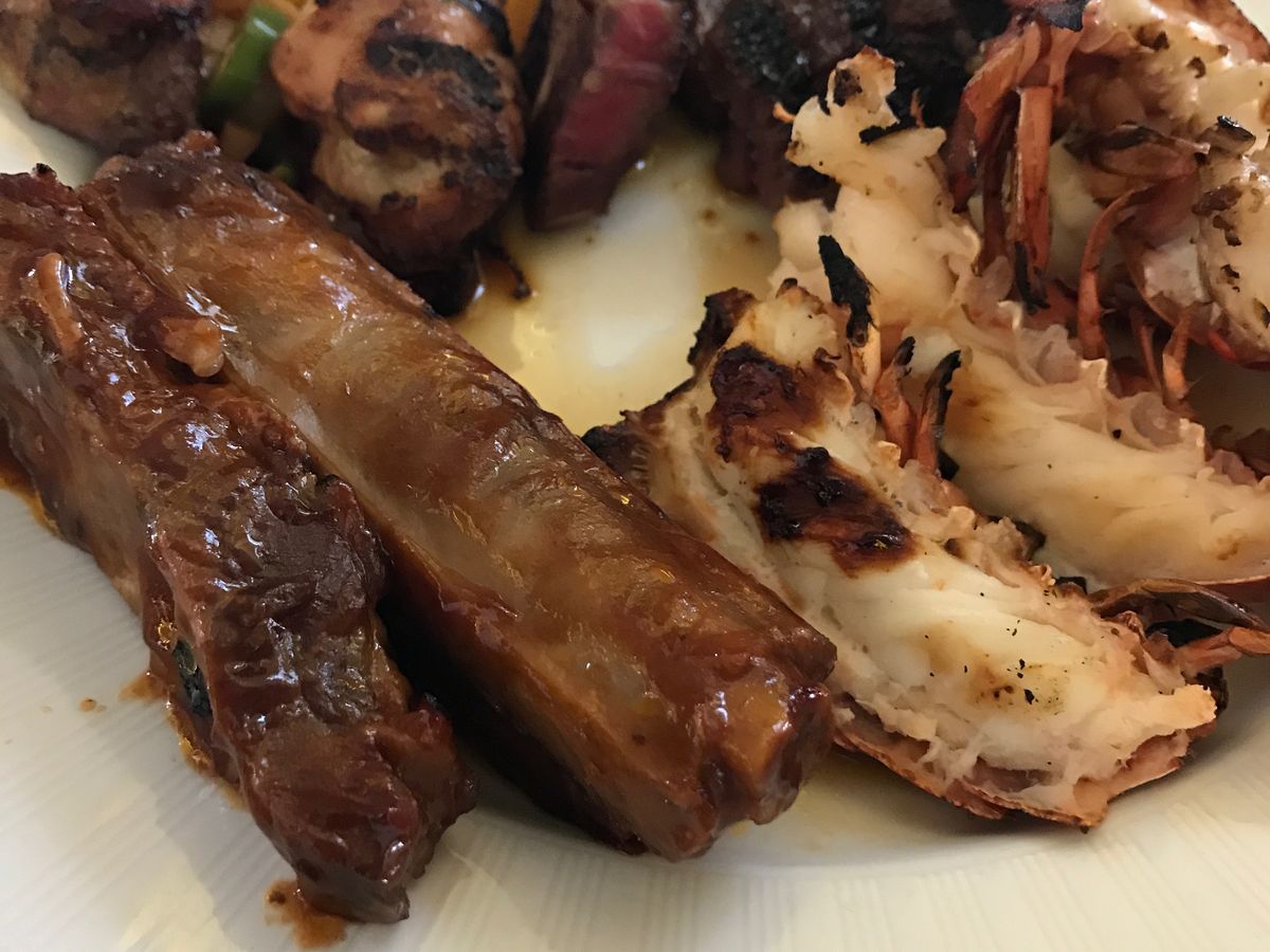 野菜好き、エビ好きなのでサラダも満足です。バーベキューはオマールエビかな?美味かった。肉はスペアリブ系でワイルドでした。