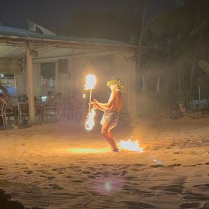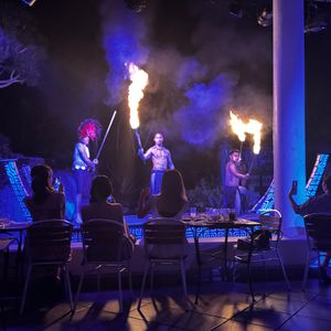 息子がステーキ🥩を6.7枚ぐらい食べたぐらいお肉が美味しかった。食事時間は1時間ぐらい、ショーが始まったら会場は真っ暗で食事が出来ないので早めに済ます事がお勧め。では、肝心のファイアーショーは最高でした。男性は力強く、女性は妖艶なダンスは見応え十分。残念なトコは、全員参加のダンスコーナーがなかった事。(時間の都合だったのか)