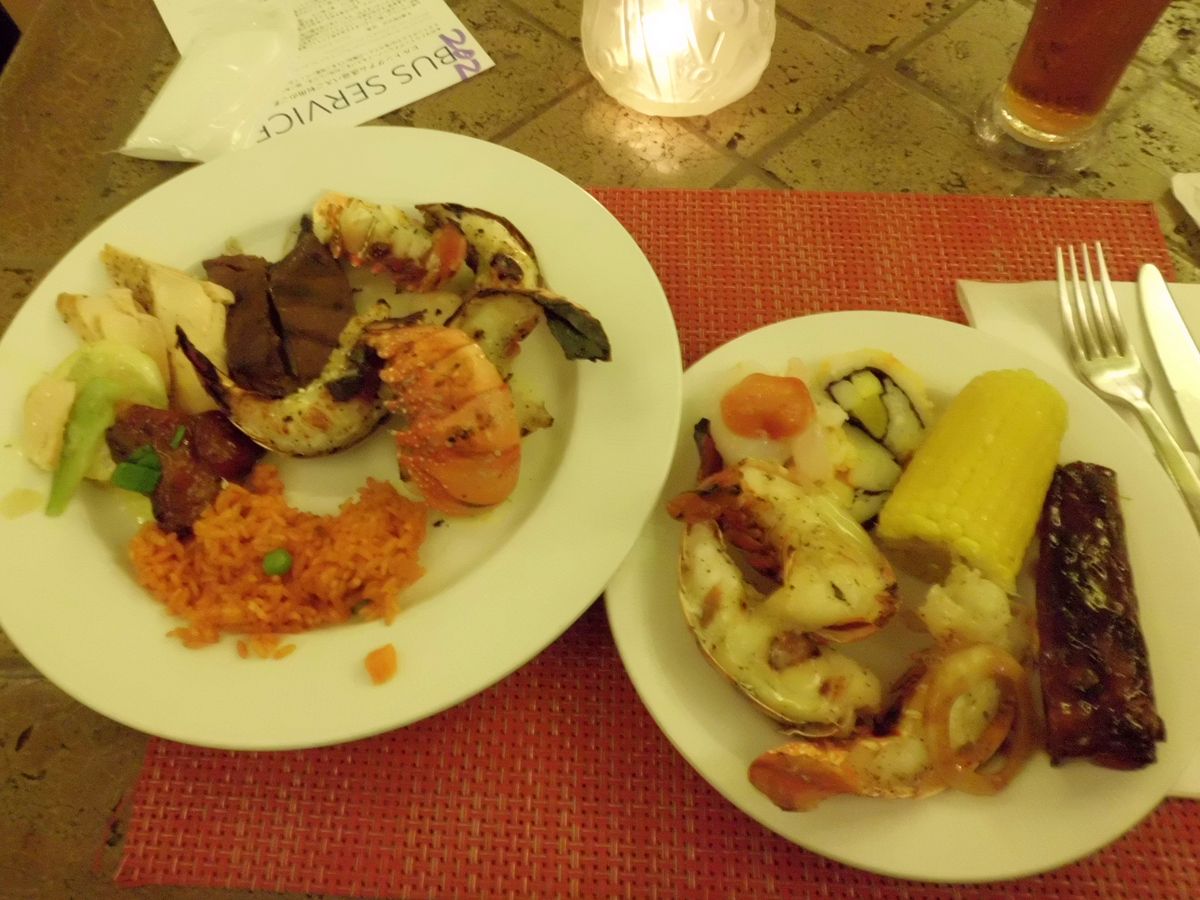 BBQをはじめとするお肉、シーフード、サラダ、パエリア、豚の丸焼き、チャモロ料理などがブッフェ形式でいただけて、デザートにはケーキやアイスもあります。ショーは伝統的なものと、客席を巻き込んだユーモアが絶妙にミックスされており、楽しめました。