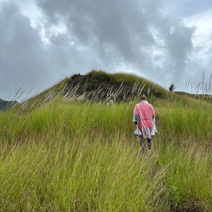 曇り時々雨のあいにくの天気でしたが、メインイベントのハイキングの時にはどうにか止んでいて、無事に歩けました。雨模様なのでカッパを貸してもらいました。