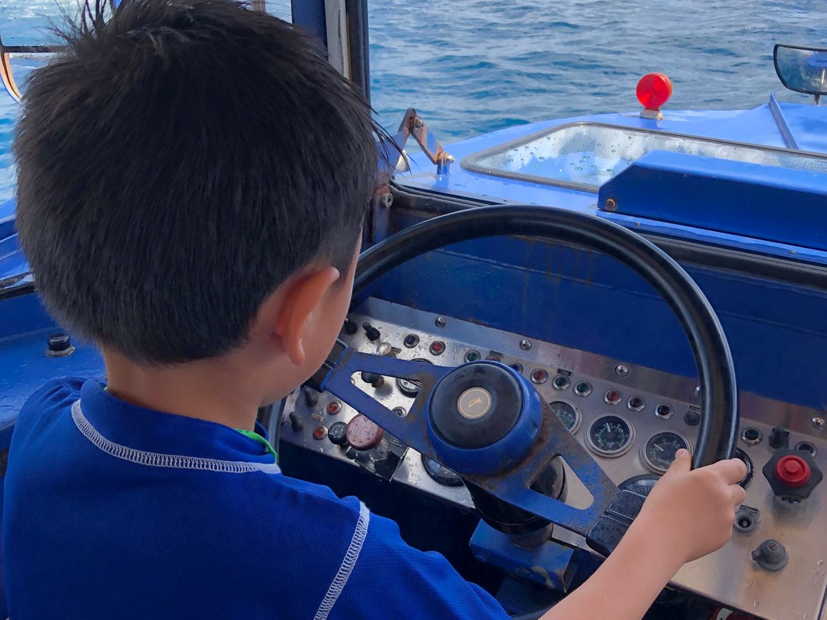 海でのクルージングでは途中で子供たちに運転を代わるサービスがあるので、子連れの家族にはオススメです。