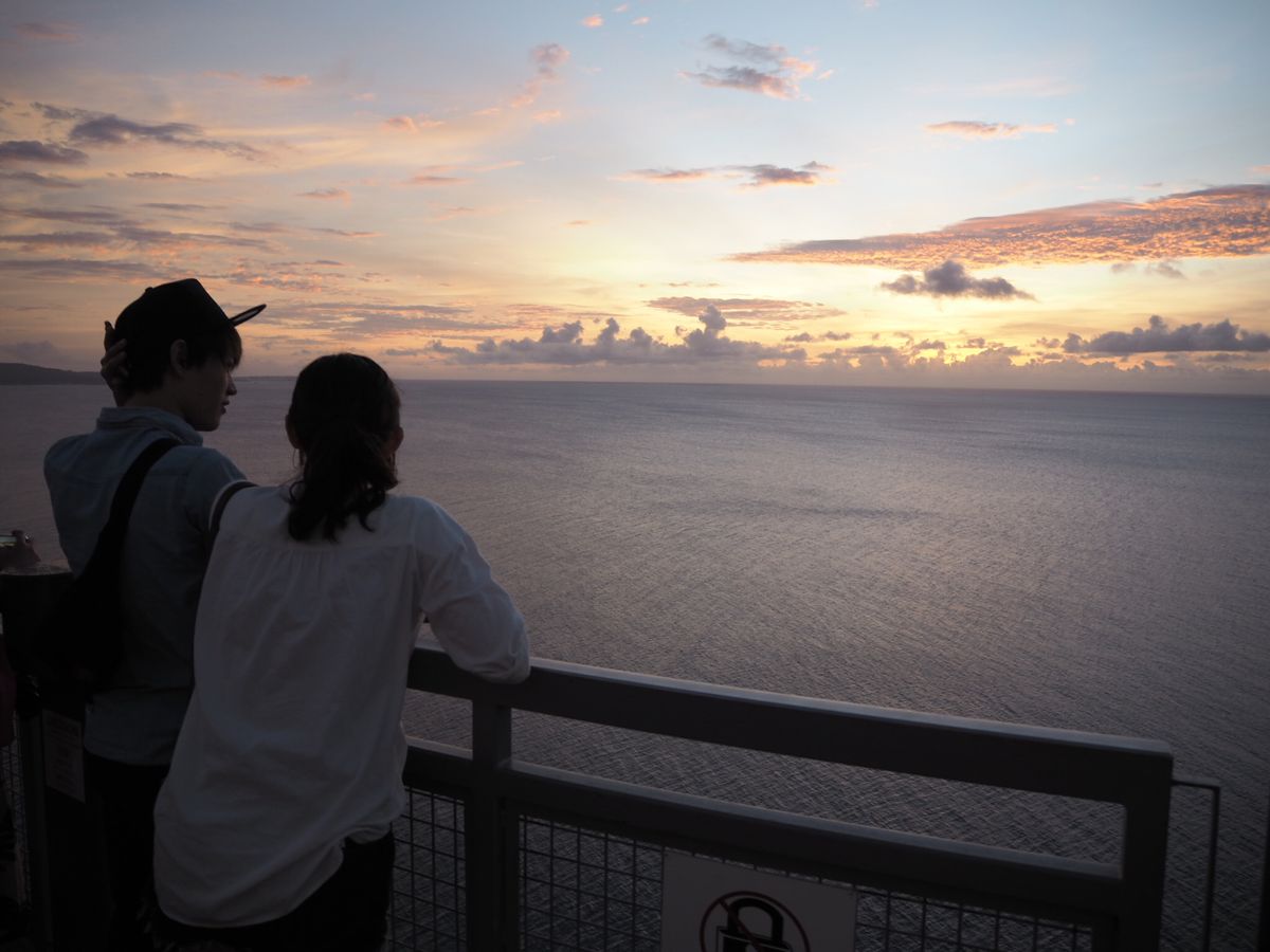 恋人岬から見える夕暮れ時の海岸の絶景と水平線に沈む夕日はとても感動的でした