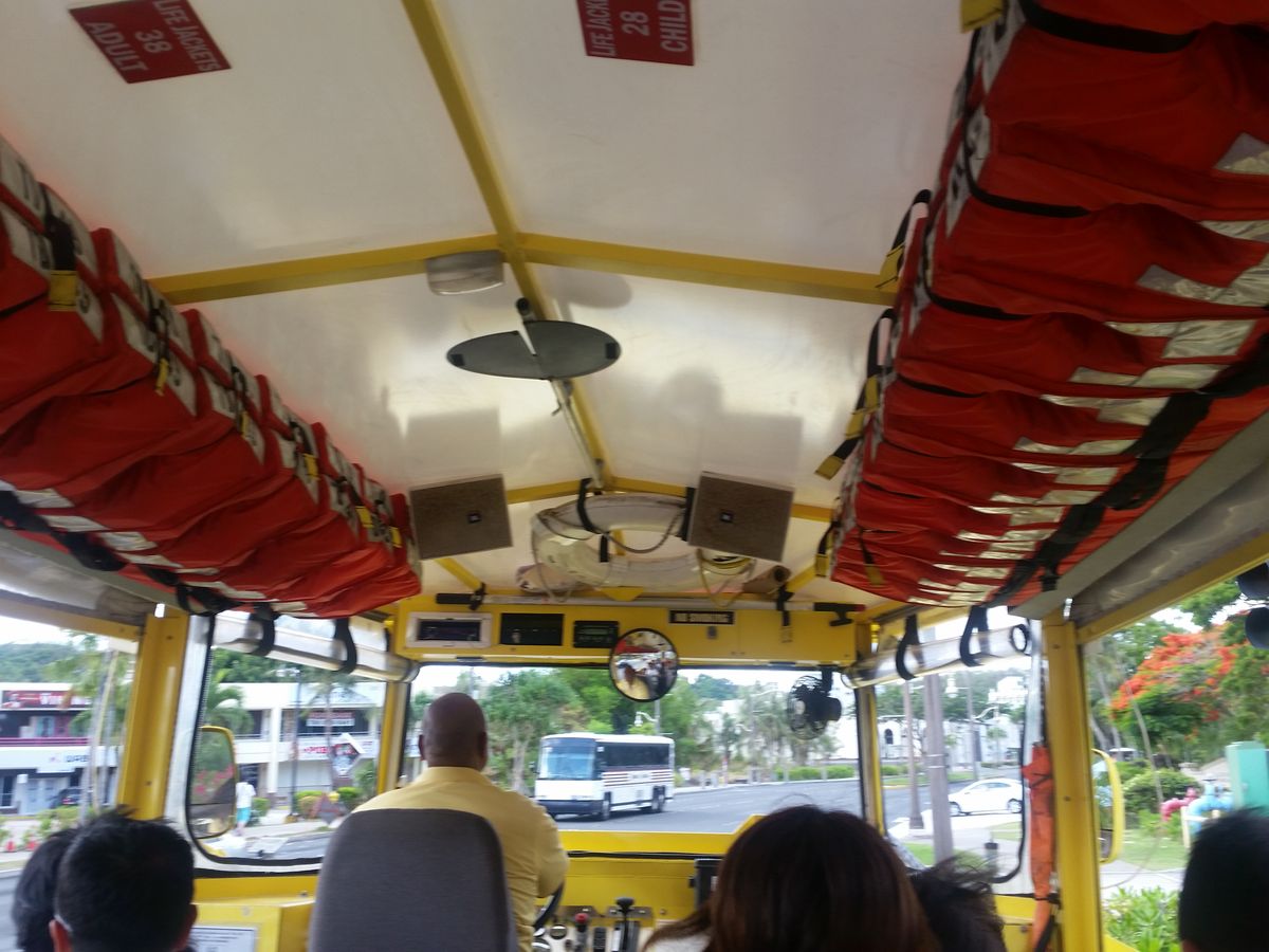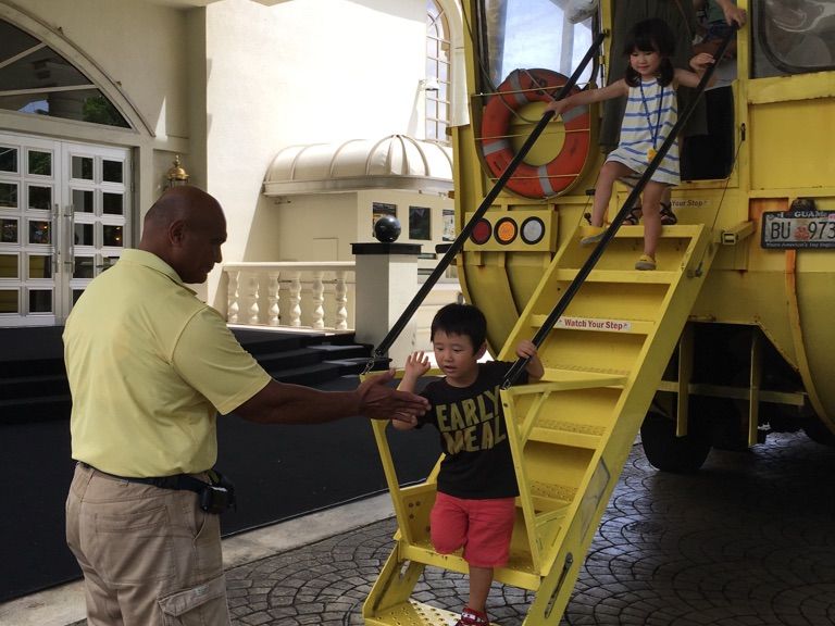 水陸両用バスツアーに家族4人で参加しました。9時集合9時半出発に自分たちで集合場所のサンドキャッスルまで移動です。自分たちはオンワードでしたのでバスの時間が間に合わないのでタクシーで20$くらい、すいていたので早めにつきました。サンドキャッスルの前にカウンターがあってそこでチェックイン、しばらくサンドキャッスルの中で涼しくバスが来るのを待ちます。バスは何便かあるので間違わないように。運転手さんは陽気で盛り上げてくれます。海までは結構な距離のドライブ、バスの中は日本語放送で周りの景色の説明がありますが、途中下車などはありません。海に着いたらドライバーが船長さんに交代して海の上をぐるっと一周します。子供たちに操船もさせてもらえます。