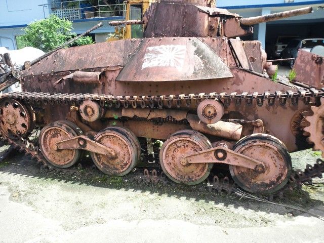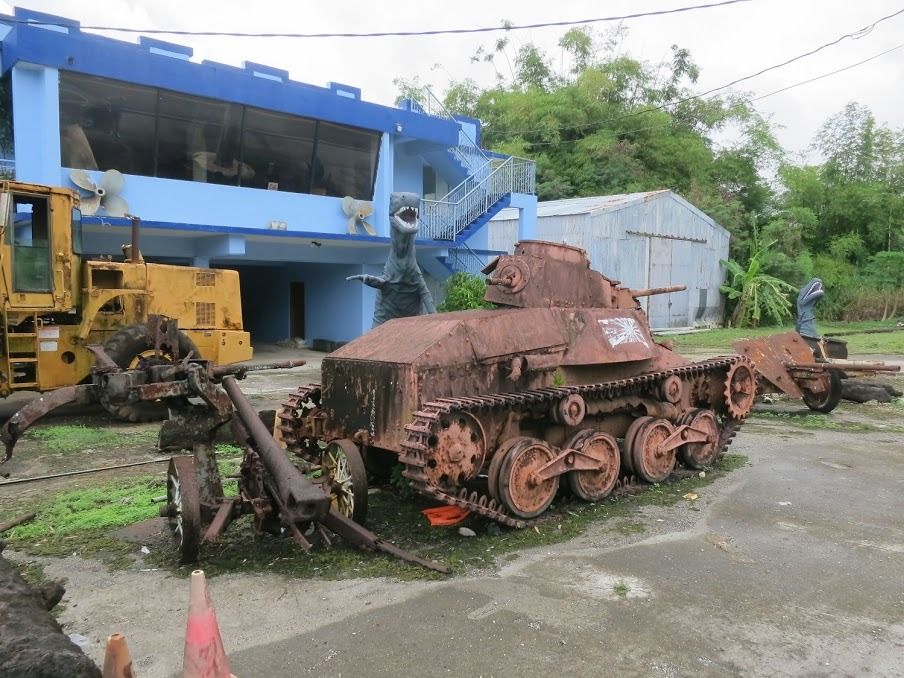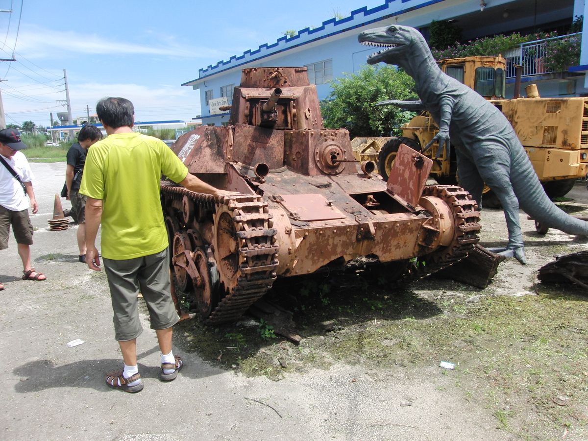 日本軍の戦車は、スクラップ業者の作業場の前に、恐竜の置物と一緒に展示されていました。