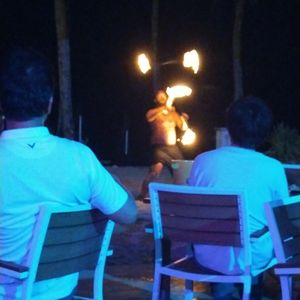 食事をしてから60分ぐらいしてファイヤーダンスショーのはじまり。迫力あって良かったですよ。ただショーは30分ぐらいで終わり、残り時間は、お誕生日の方が会場に何人かいまして、その人たちと踊ってました。あとは参加型のダンス、最後は順番に並んで記念撮影。で、ホテルまで送ってくれました。