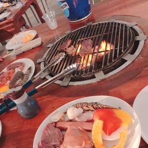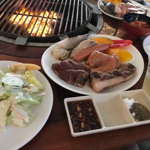 BBQの種類も多く大満足。海鮮系、肉、野菜、ご飯がありました。飲み物は現地でしか買えない7upなどありました。