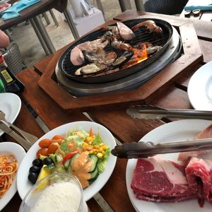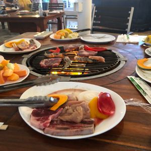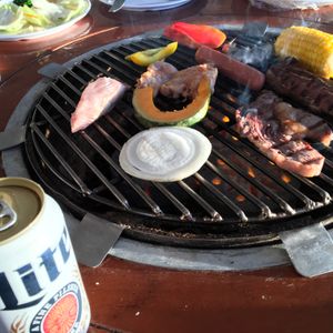 本格的なBBQで予め皿に盛られた肉魚を焼き、サラダ、ゴハン、ソーメン、キムチは食べ放題。