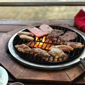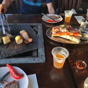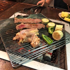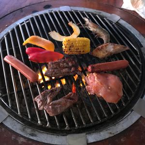 料理する肉の量もボリュームがあり、ビーフ、チキン、エビ、カジキ、など充実したバリエーションで満足でした。またうちの子は、食べ放題のトウモロコシは割り箸に刺して沢山食べてました。その他にも、キムチ、じゃがバター、サラダも食べ放題でかなりお得だと思います。あとビールやジュースもおかわり自由です。
