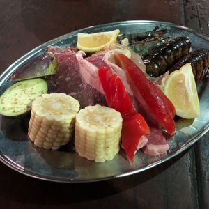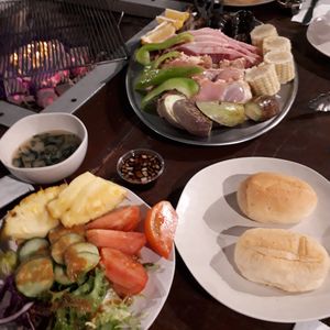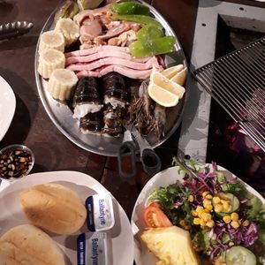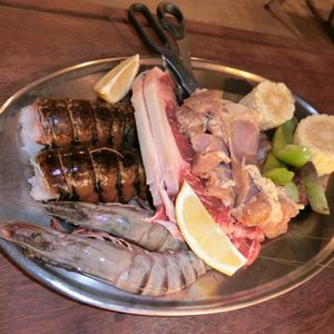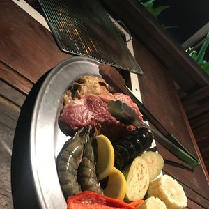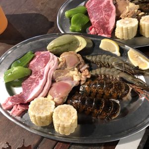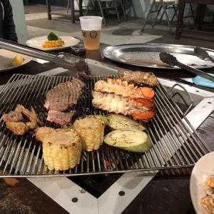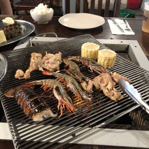 とてもわかりやすい場所で、迷わず到着。着くととてもいい匂いが漂っていました。先に案内されて、食材が運ばれてきてうきうきわくわく。大好きなエビと、ロブスター、牛肉、鶏肉、お野菜、とてもたくさん。