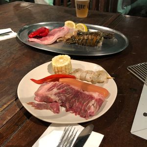 肉、魚介の食べ放題、美味しかった。常にスタッフが飲み放題ビールをついでくれる。迫力のダンス!からの観客から何人か選ばれステージへ。子供が選ばれてステージで踊ってた。記念にフィエスタのぬいぐるみをもらえたし、本当にいい思い出になりました。