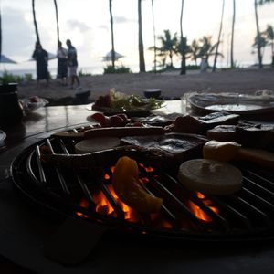 会場はビーチに面しており少し歩くと波がみえます。会場に到着するなり食事開始です。日が暮れると肉の焼き加減が分からなくなるので、