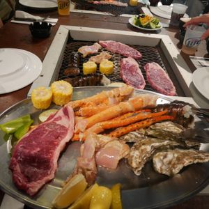 ステーキ、ロブスター、カニ、カキ、ソーセージ、チキンのセットに、サラダバー、ごはん、味噌汁とボリュームも十分。