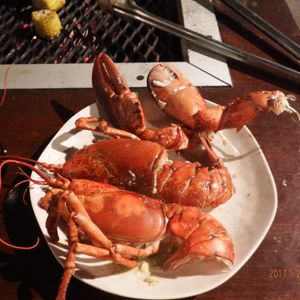 まだ動いている活きロブスターが丸ごと2匹。ほっと一安心。このまま焼いても食べれないので半分にカットしてくれと言うと、何やら言って戻っていきました。待てども待てども私たちのロブスターは戻って来ない。しかし、しばらくして戻ってきました。きれいに焼いてくれて1/2カット。ミソもきれいに残っていました。至福の瞬間です。隣の席ではロブスター丸ごと焼きでお店のスタッフがハサミでズタズタにカットしておりました。ああゆう食べ方もあるのかな?
