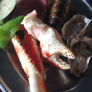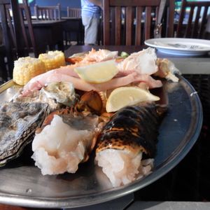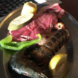 グアム滞在2日目で妻と二人で初めて利用させていただきました。ここから見えるサンセットが素晴らしいとのことで、6:00PMからのディナーを予約していました。宿泊ホテルの隣だったので歩いていざセイルズへ。受付は行列ができていましたが、対応が良いのかそんなに待つことなく、バウチャーを提示するとすぐにテーブルへ案内してくれました。運ばれてきたのはシルバーのプレートに乗ったステーキ、チキン、オイスター、コーン、ピーマン、ナス???? 確か予約では活きロブスター尾頭付きも入っていたはず???