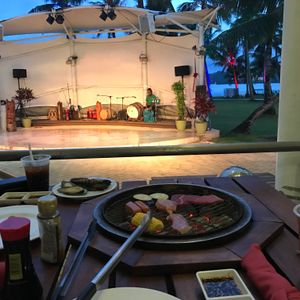 ここのBBQはとにかくボリュームがあり、女性だと食べきれず男性でも多い方は多いくらいのボリュームです。家族で行きましたが、全ては食べきれませんでした。ビュッフェの中にごはんもあるので、日本食が恋しくなりご飯食べたい人には向いていると思います。他にもサラダ、フルーツは食べ放題なのでバランスよく食事ができると思います。サンセットは席によって見えるか見えないかと行ったところです。浜辺に出た方がいいかなと思います。時期により卒業旅行もあるのでデートというよりはで家族や団体のが楽しいかなと思いました