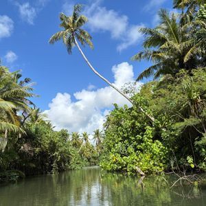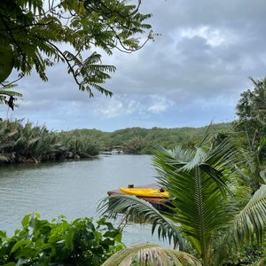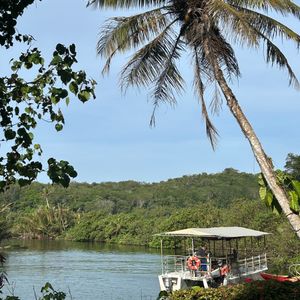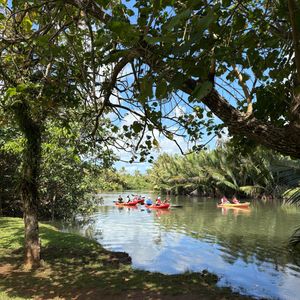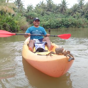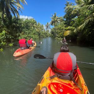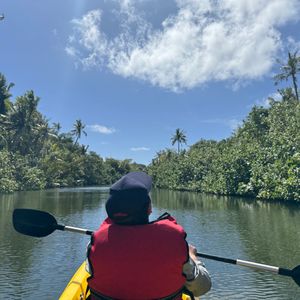 3人で参加しました。カヌーは2人一組のため、1人は他のグループの方と一緒にのりました。カヤックは遺跡まで。途中、カニなど自然の動物を数種類見ることができました。遺跡につくと植物の説明や昔の住居の作り等を見学と記念撮影。その後、火おこしや葉っぱで作った小物など昔の暮らしを見学。何名かは体験もしていました。ここで船のツアーの方達と合流でした。ランチを食べた後は動物等を見学しながら歩いて移動。葉っぱでエンゼルフィッシュをつくる体験を行い、全員船で元の場所に戻りました。川の水が思ったより茶色く驚きましたが、カヌー体験は楽しかったので小さなお子さんが居なければ船のツアーよりカヤックをお勧めします。ランチ、美味しかったです!