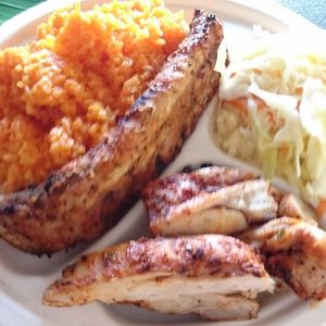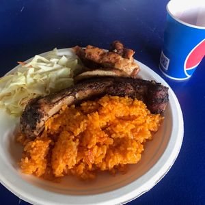 内容はレッドライス、ポークとチキンのバーベキュー、サラダ、デザート、飲み物には水とレモンティー(甘い)が用意されていました。