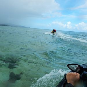 私たちが借りたジェットスキーのエンジンの調子が良く無く、主人とガイドさんがチェンジして私は結局ガイドさんの後ろに必死につかまって乗りました。