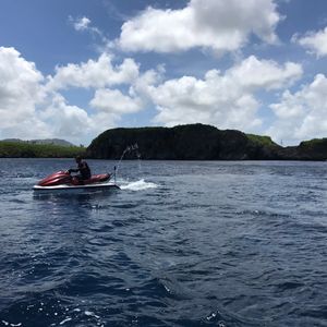 二人乗りのジェットスキーでまず私が運転!初めての運転でしたのでスタート直後は現地のインストラクターの方に付いていくのに必死でしたが、当然、道路も信号も無いのでアクセル握って突っ走るのみ。ただ曲がることだけコツがいりましたね。ハンドル切っただけでは曲がらず体重移動とアクセルとのバランスが必要でした。でも難しくは無いのですぐに慣れ、最高速度50キロ(まだ出るよ)、景色を楽しみ、風と波しぶきと「爽快で気持ちいい」の一言です。